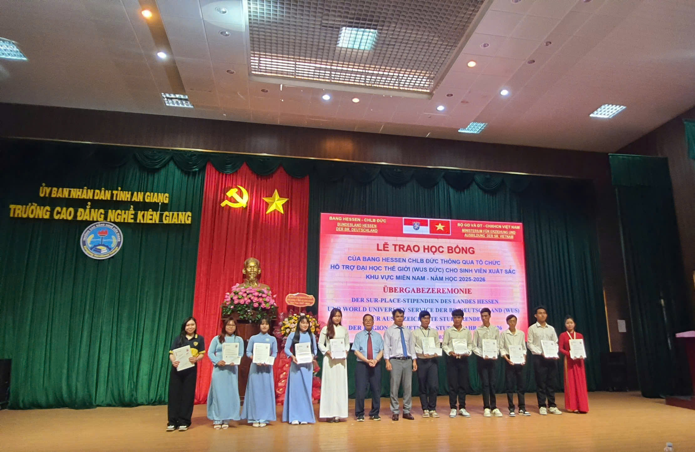 Ngày 17/3/2026, 03 sinh viên Trường CĐCĐ Sóc Trăng đã được đại diện Quỹ học bổng Hessen của Bộ Khoa học và Nghệ thuật Bang Hessen - Tổ chức Hỗ trợ Đại học Thế giới Cộng hòa Liên bang Đức, Hội Hữu nghị Việt Nam - Đức trao học bổng Hessen năm học 2025 - 2026 khu vực đồng bằng Sông Cửu Long tại Trường Cao đẳng nghề Kiên Giang.
