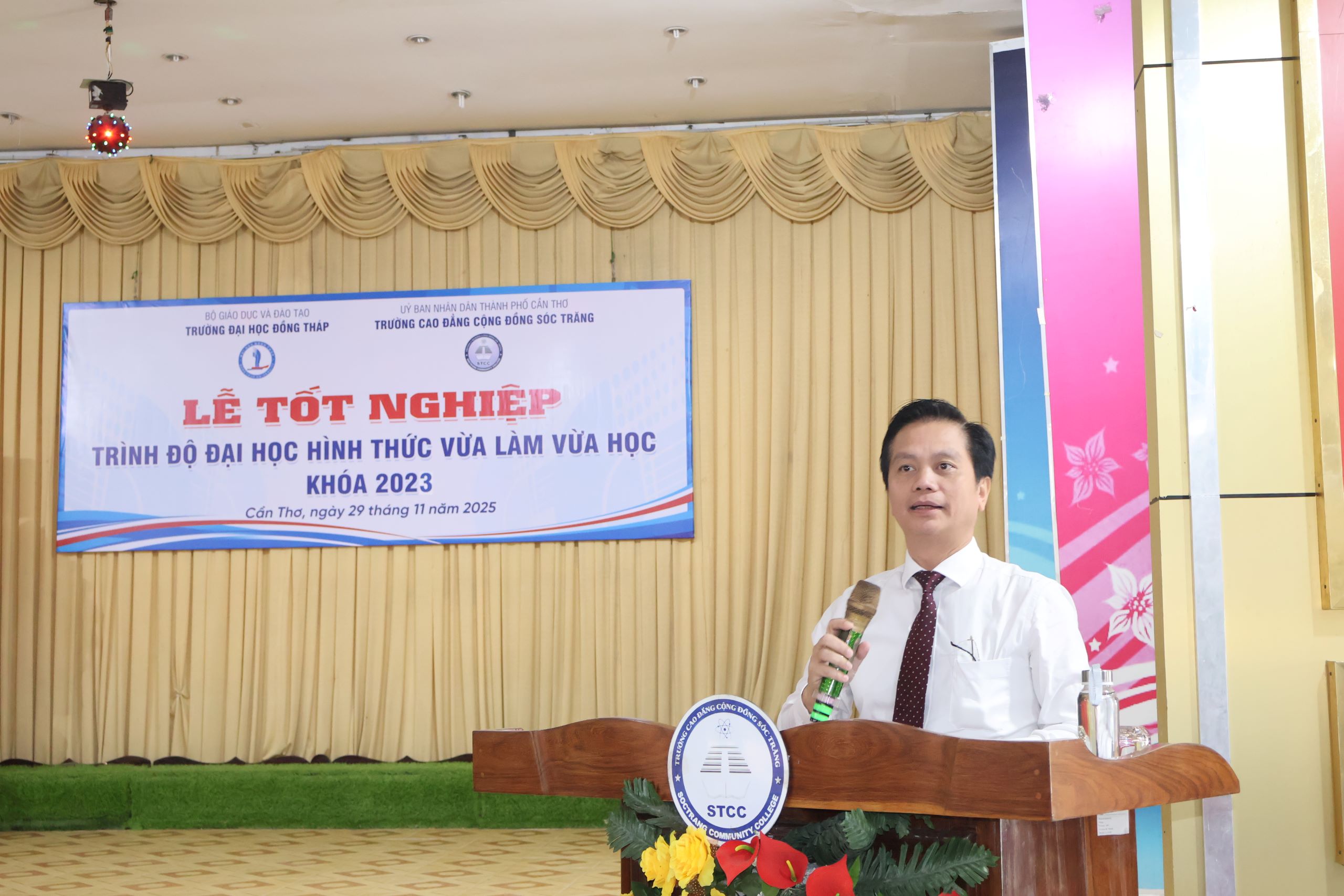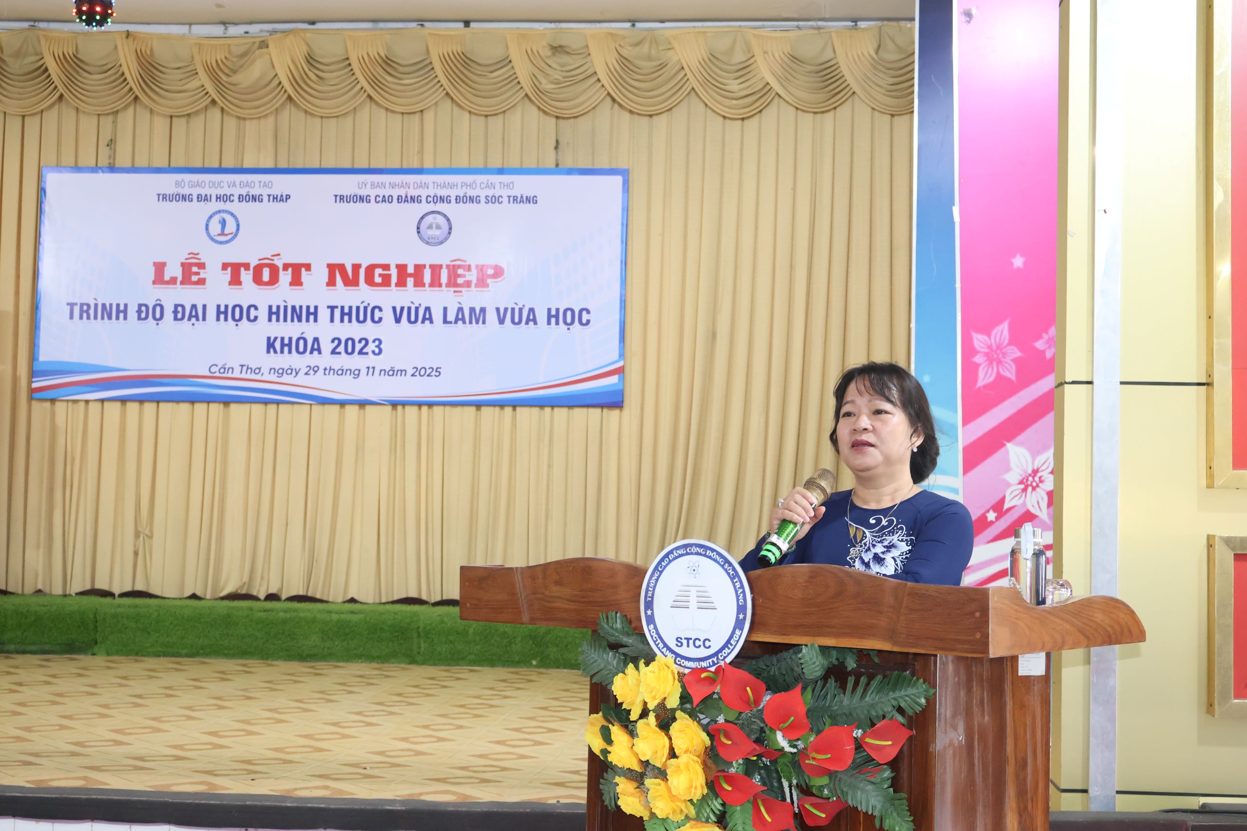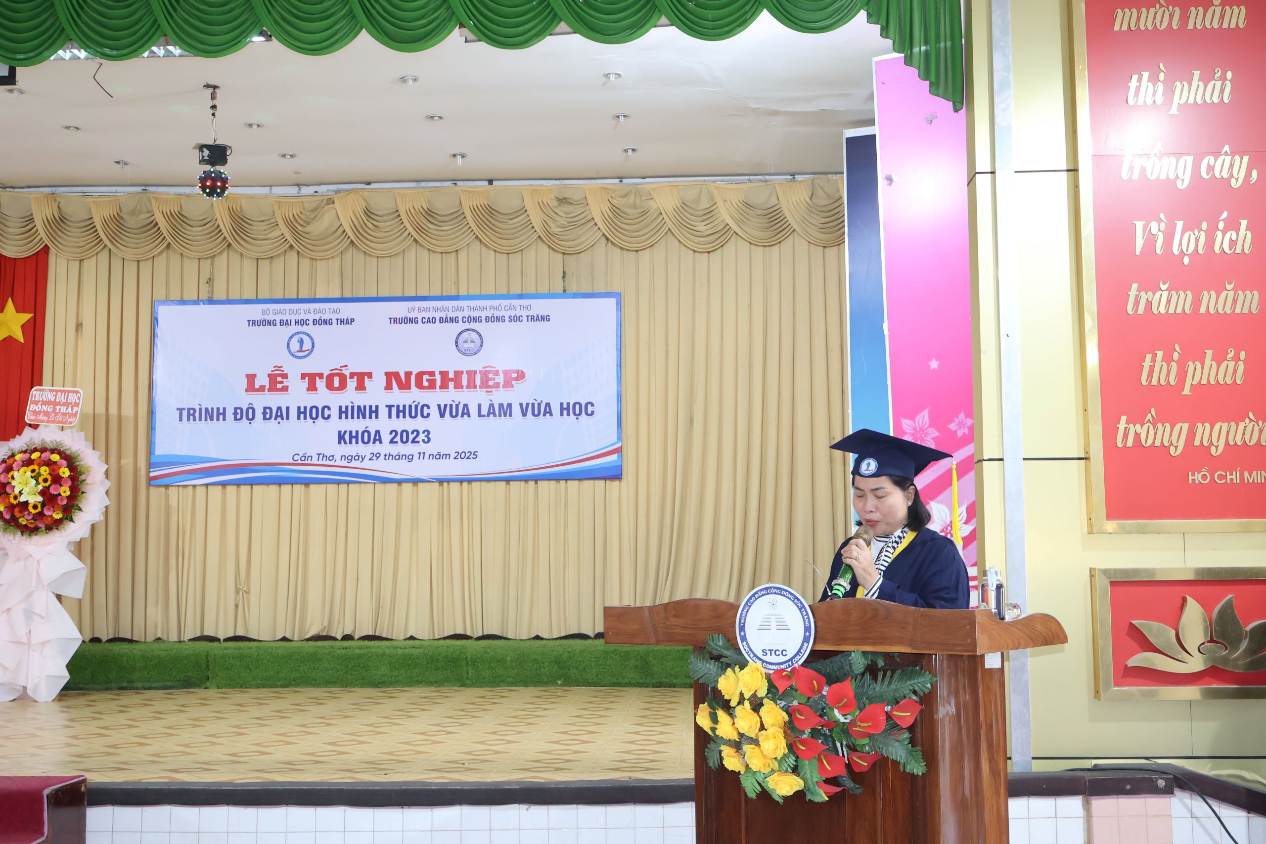 Cũng trong không khí trang trọng này, đại diện lãnh đạo Trường Cao đẳng Cộng đồng Sóc Trăng, cô Đinh Thị Thái Hà đã phát biểu chúc mừng và bày tỏ niềm tự hào: “Sự thành công của các tân cử nhân là thành quả của sự nỗ lực cá nhân, sự hỗ trợ từ gia đình và sự hợp tác hiệu quả giữa Trường Cao đẳng Cộng đồng Sóc Trăng và Trường Đại học Đồng Tháp. Chúng tôi cam kết sẽ tiếp tục duy trì và phát triển mối quan hệ hợp tác này, nhằm mang đến nhiều cơ hội học tập chất lượng hơn nữa cho các học viên.”